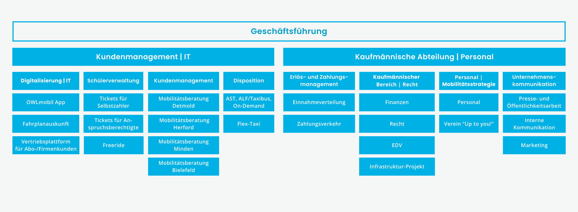 Sie möchten gerne wissen, wie die OWL Verkehr GmbH als Unternehmen aufgebaut und strukturiert ist? Dann werfen Sie einen Blick auf das Organigramm.