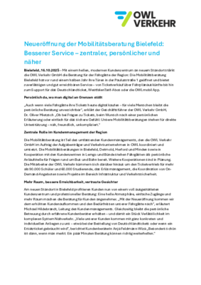 Die Mobilitätsberatung Bielefeld ist Teil des umfassenden Kundenmanagements, das die OWL Verkehr im Auftrag der Aufgabenträger und Verkehrsunternehmen in OWL koordiniert und umsetzt. Neben telefonischen und digitalen Serviceangeboten können sich Fahrgäste vor Ort in Bielefeld und an weiteren Standorten in Ostwestfalen-Lippe rund um das Thema Bus und Bahn informieren und beraten lassen.