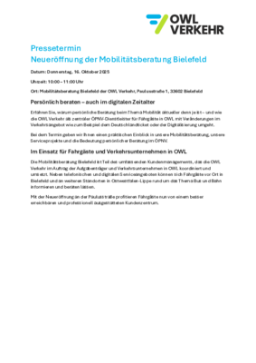 Hier erhalten Sie alle Infos rund um unseren Pressetermin “Neueröffnung der Mobilitätsberatung Bielefeld”.