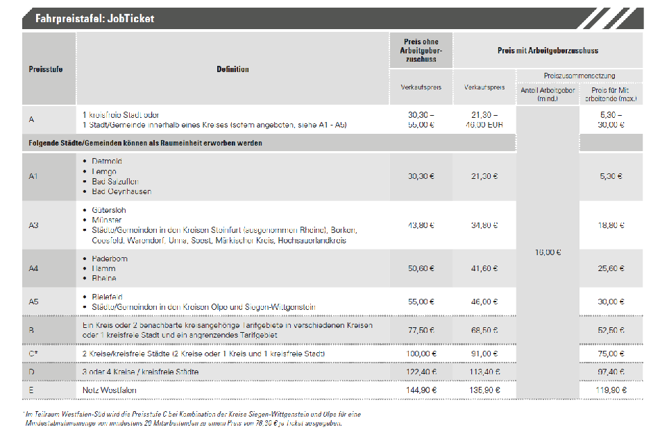 Mit dem Arbeitgeberzuschuss wird das JobTicket Westfalen günstiger: Pro Ticket gibt es einen zusätzlichen Rabatt vom Verkehrsunternehmen. Fragen Sie in Ihrem Unternehmen nach, ob eine Bezuschussung durch den Arbeitgeber möglich ist.