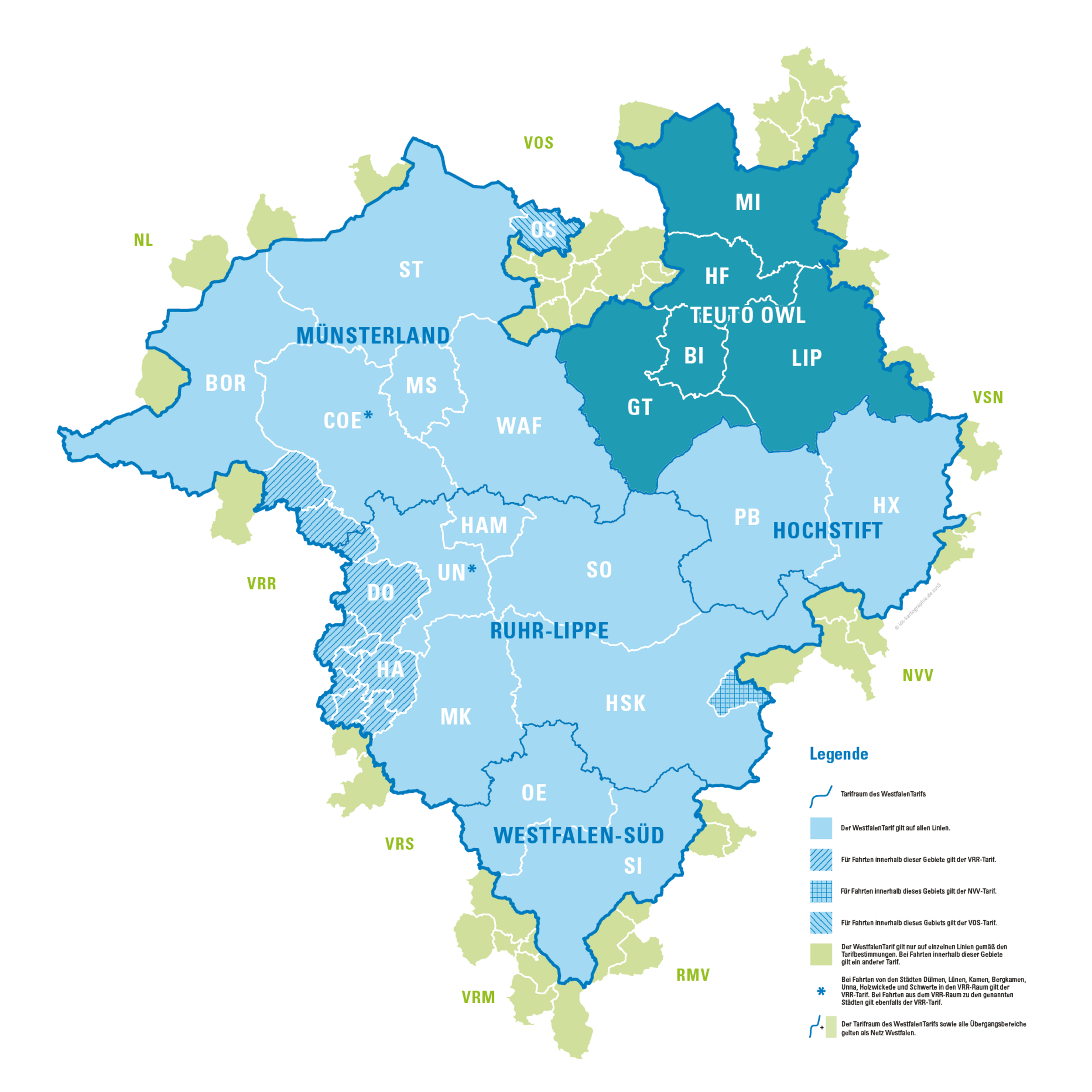 Der WestfalenTarif umfasst den Raum Westfalen-Lippe. Zusätzlich gilt er auf ausgewählten Strecken ins Ausland und in andere Bundesländer.